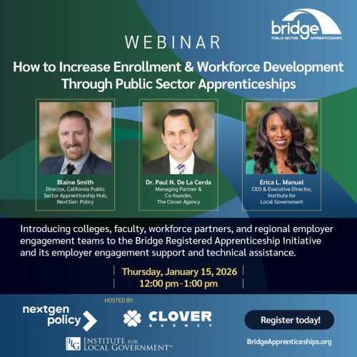 Through funding from the Irvine Foundation, the Broad Foundation and the U.S. Department of Labor’s Apprenticeship Building America (ABA2) initiative, the Bridge Public Sector Apprenticeships initiative has launched a California Public Sector Apprenticeship Hub to expand non-traditional Registered Apprenticeships across cities, counties, and special districts.